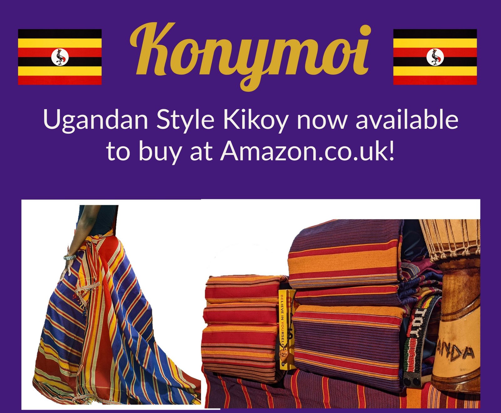 We sell beautiful and vibrant Kikoys. These colourful Ugandan Kikoys are multi-purpose. They can be used to for outfits, as a wrap / sarong / throw, bedding, certain drape, and much more. They are available in both cotton and polyester materials. They they come in super-large sizes.